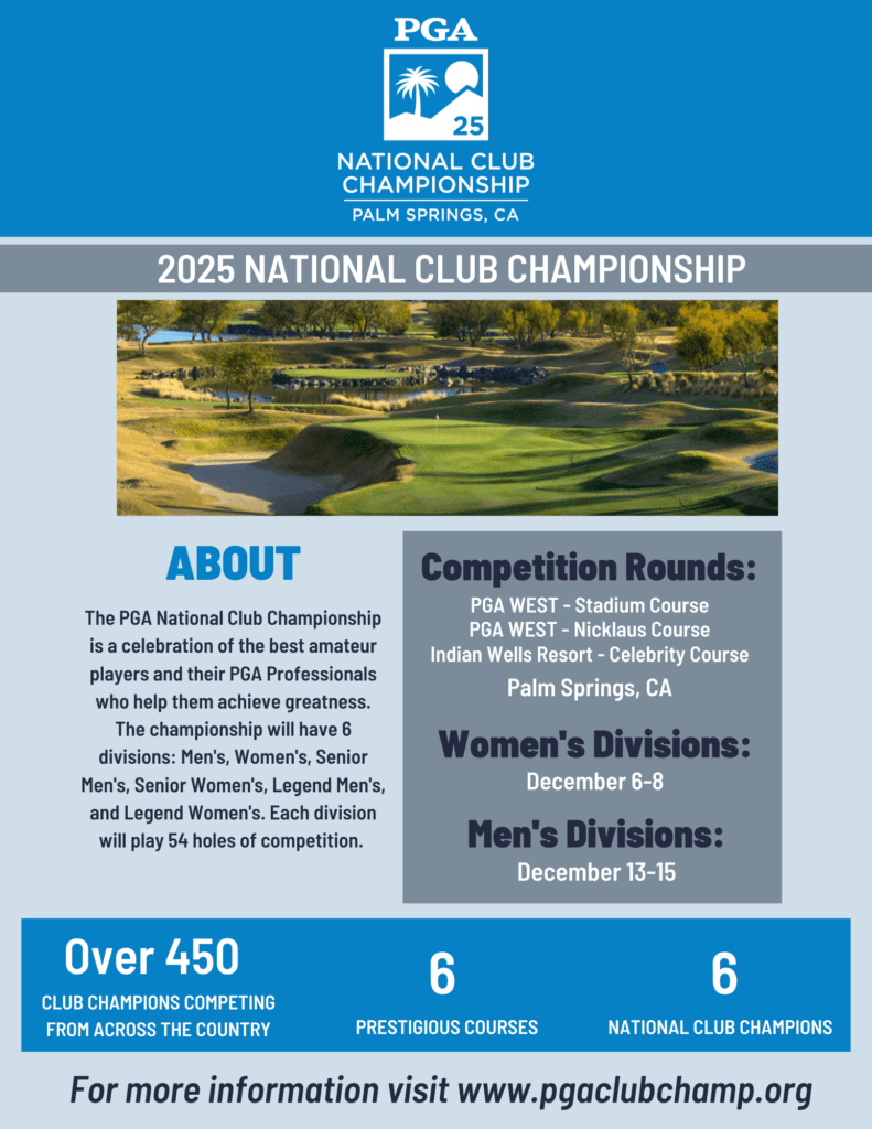 The 2025 PGA National Club Championship heads to Palm Springs in December of 2025. This invite-only tournament field will be made up of the top amateur golfers from around the country who have won their club championship during the 2025 calendar year. The championship brings together a wide variety of golfers from all 41 PGA Sections and all 50 states. Public or private. Small or large.